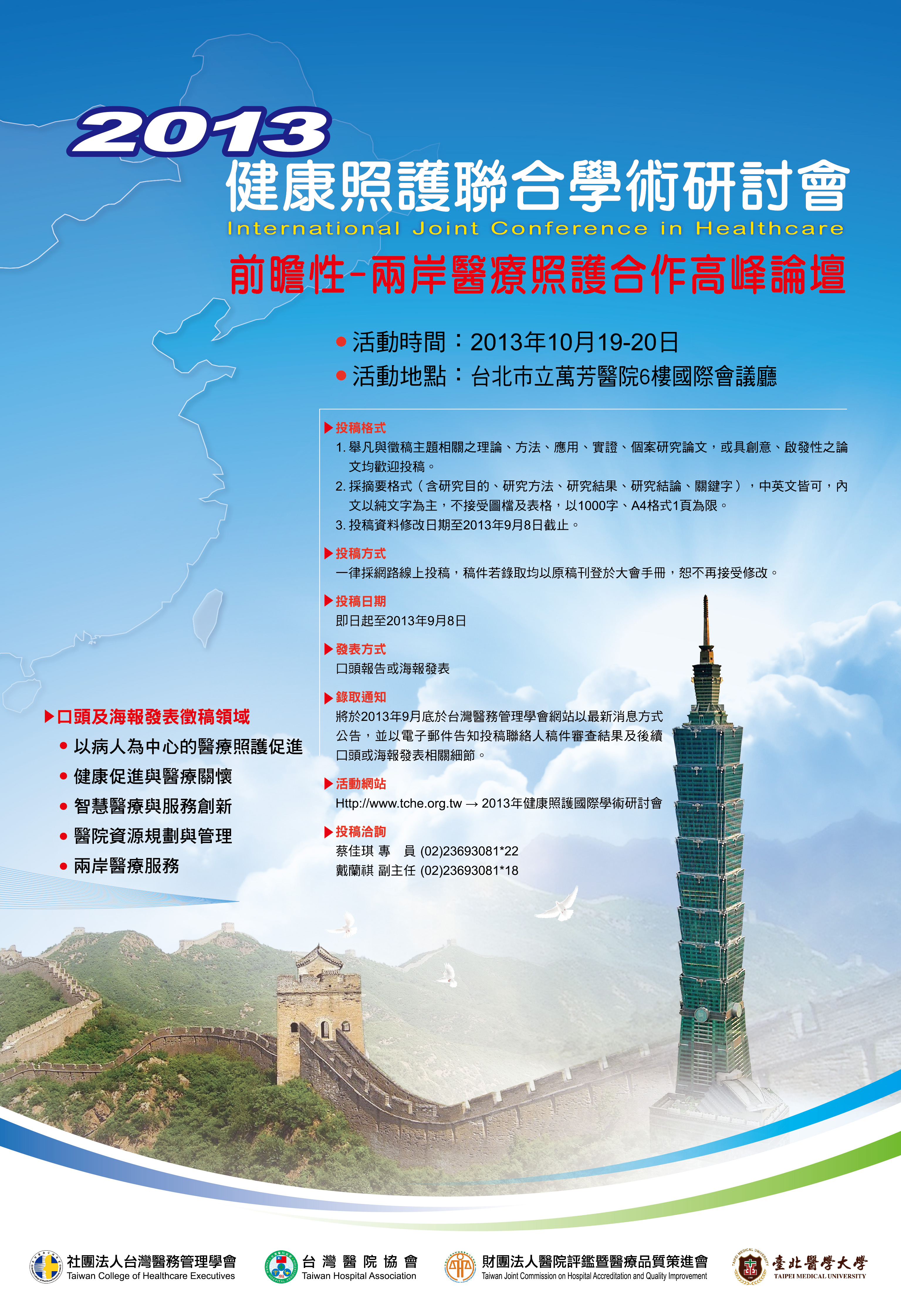代轉知台灣醫務管理學會訂於102年10月19日(六)~10月20日(日)假台北市立萬芳醫院六樓國際會議廳(台北市文山區興隆路三段111號)舉辦「2013健康照護聯合學術研討會」,為促進活動的多元性,將進行論文徵稿活動,期以提供院際間相互學習之經驗分享平臺,並藉此相互激勵提供優質化的醫療服務。